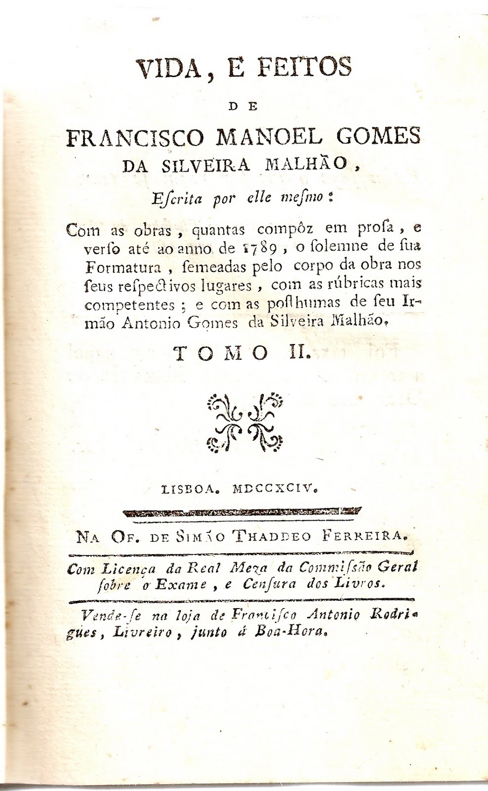 Tudo isto a propósito de, ontem, ter conseguido o II volume, que me faltava, da "Vida, e Feitos de Francisco Manoel Gomes da Silveira Malhão" (1794), de que há uns bons dez anos tinha comprado, na Livraria Histórica e Ultramarina, os tomos I e III. Este segundo volume foi adquirido na Rua do Alecrim, afortunadamente, e está em muito bom estado (ver imagem do frontispício).