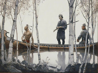 Wyeth colaborou na ilustração de mais de uma centena de livros, muitos deles sobre o Oeste americano como, por exemplo, O último dos moicanos, de James Fenimore Cooper. E eu gosto particularmente do poster Ore Wagon (1907), com um pormenor do condutor da diligência. Ou desta serena paisagem que, em 1934, N. C. Wyeth pintou sobre a zona marítima da Costa do Maine.